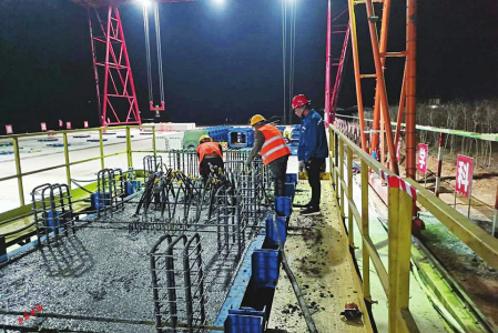白玉河1号大桥作为我省首例装配式预制桥梁,其技术操作难度大、质量精度要求高。为确保首件盖梁施工高质量安全完成,项目经理杨海峰多次深入施工现场,组织管理人员群策群力,优化施工方案,有效缩短盖梁钢筋、模板安装时间;同时,白玉河1"大桥党员先锋队倒排施工计划,与作业人员日夜奋战,并多次进行施工技术、安全及质量交底,为盖梁顺利浇筑打好基础。最终,在大家的共同努力下,首片盖梁历时3.5小时顺利浇筑完成。